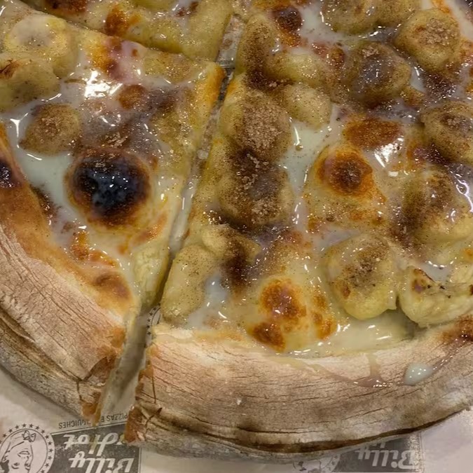 Pizza estilo Napoletana 27cm feita com farinha Italiana 00, bananas fritas na manteiga, mussarela, açucar de confeiteiro e canela.