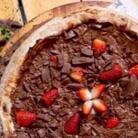 Pizza Napolitana de Chocolate. Massa com farinha italiana 00, chocolate com avelã , mussarela e morangos. Deliciosa e perfeita para ser apreciada por duas pessoas, desfrutando juntos de um momento doce e especial.