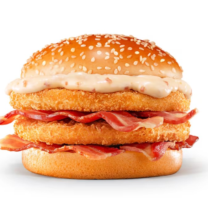 Dois suculentos empanados de frango Seara, super crocante, maionese sabor bacon, o dobro de fatias de bacon, em um pão brioche quentinho. Um baconzudo de responsa!