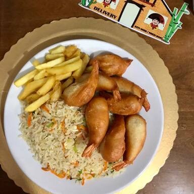 Arroz chinês acompanhado por filé de camarão empanado e batata frita