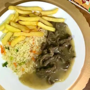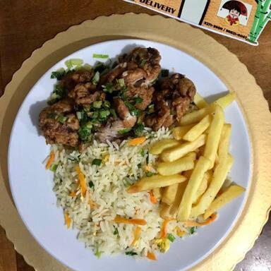 Arroz chinês acompanhado por carne em cubos e batata frita. Podendo escolher entre nossa versão acebolada, com pimentão, com ambos legumes ou, ainda, sem legumes.