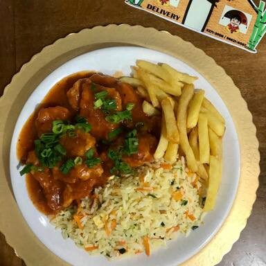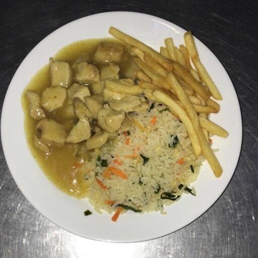 Cubos de frango ao molho indiano acompanhado por arroz chinês e batata frita.