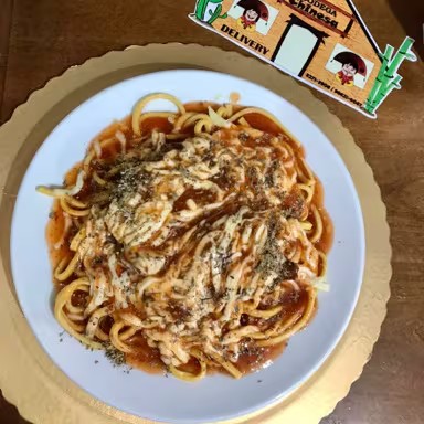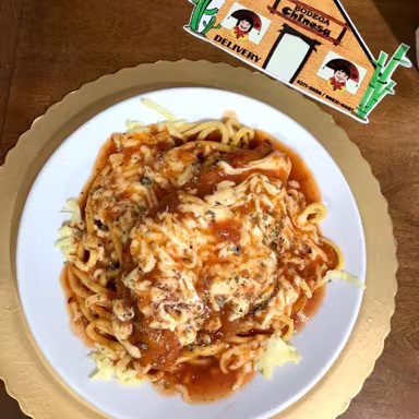 Filé de carne à milanesa e queijo ao molho de tomate. Podendo escolher entre o acompanhamento com arroz chinês e batata frita ou macarrão.