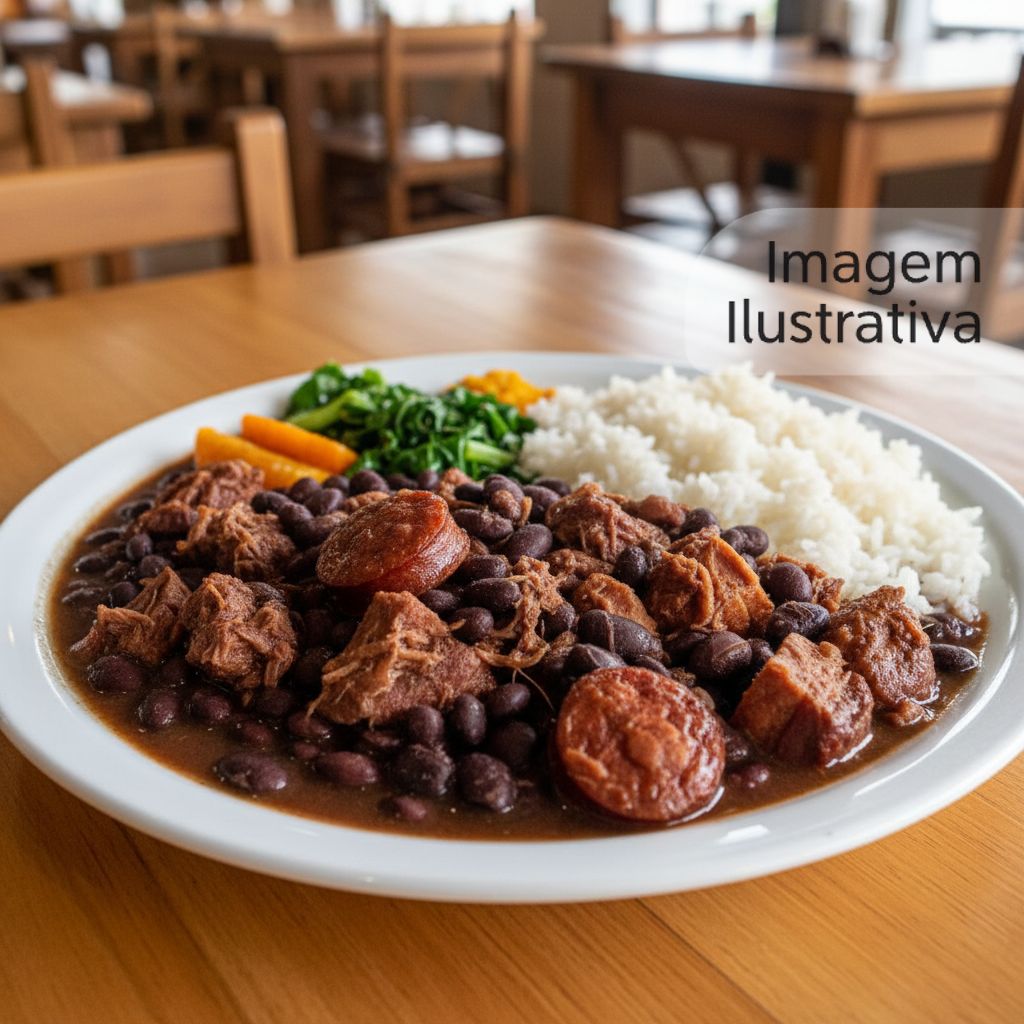 Tradicional feijoada com feijão preto, bacon, paio, calabresa, lombo, acompanhada de couve refogada, arroz branco, farofa, molho vinagrete e laranja.