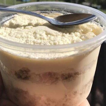 massa de baunilha com cobertura de ninho e leite polvilhado em cima.
