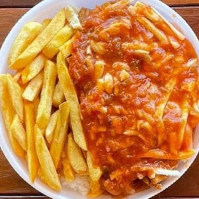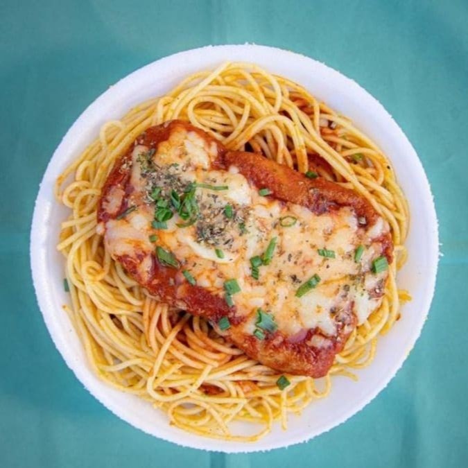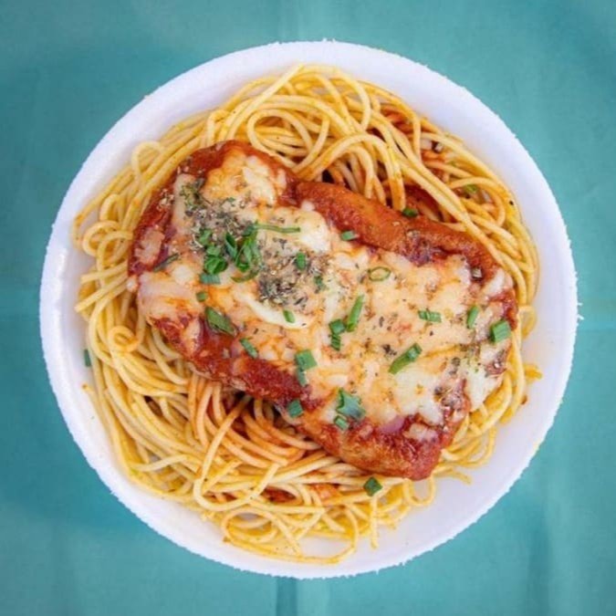 Filé de frango empanado coberto por um molho caseiro delicioso de tomate e queijo. Acompanhado de espaguete ao alho e óleo e batata frita crocantes.