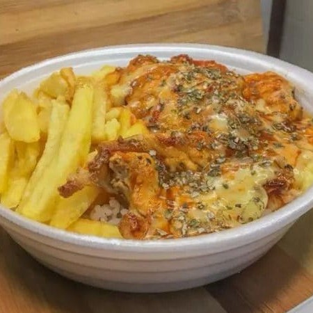 Um delicioso frango empanado, coberto de molho de queijo. Acompanhado de feijão tropeiro da casa, arroz, vinagrete e batata frita