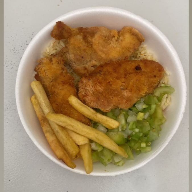 Delicioso filé de peito de frango empanado, acompanhado de feijão de caldo ( carioca ). Com arroz soltinho, farofinha da casa, vinagrete e batata frita crocante. Uma deliciosa refeição para seu almoço!