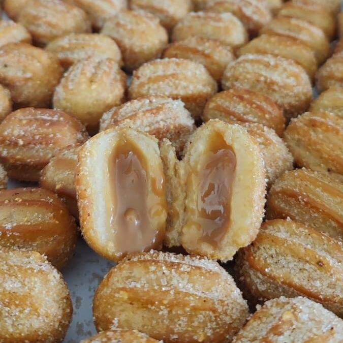 Massa deliciosa sabor baunilha com recheio cremoso de doce de leite, polvilhado com açúcar e canela.