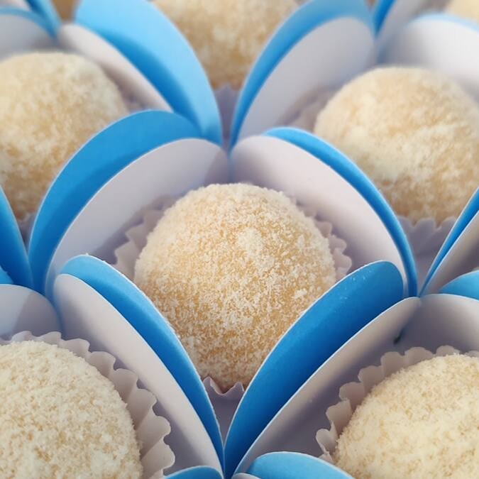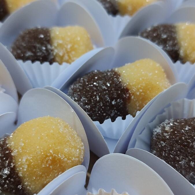 Feito com leite condensado creme de leite e chocolate 50% cacau. Meio brigadeiro branco, meio ao leite , envolvido com açúcar cristal.