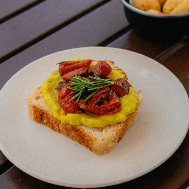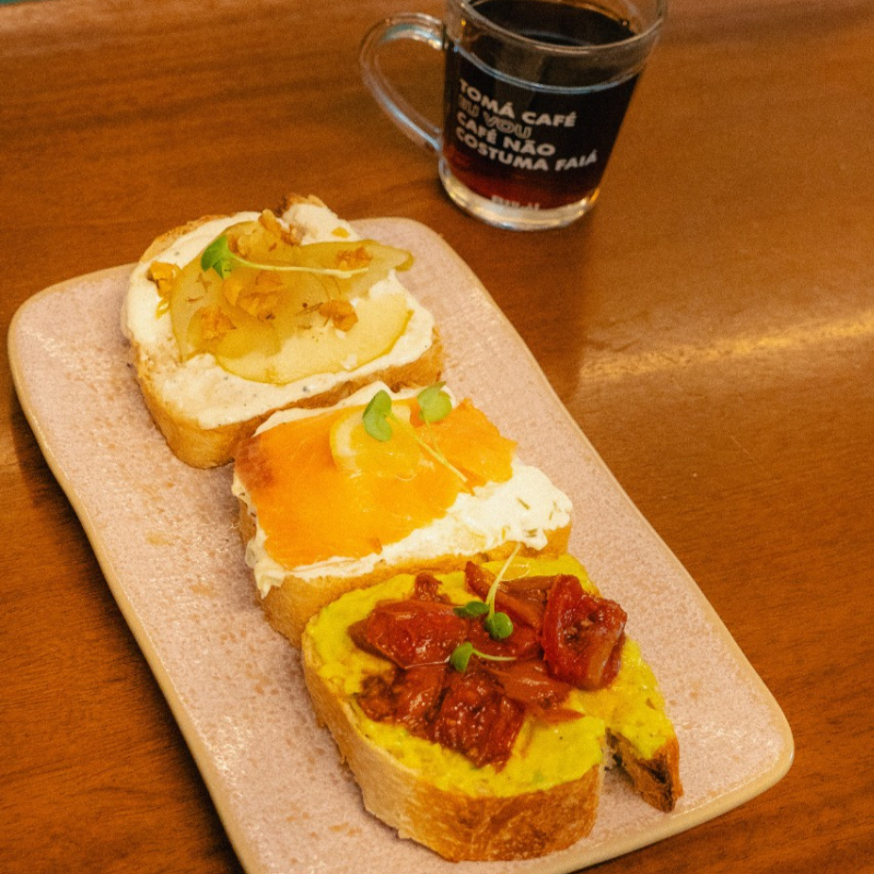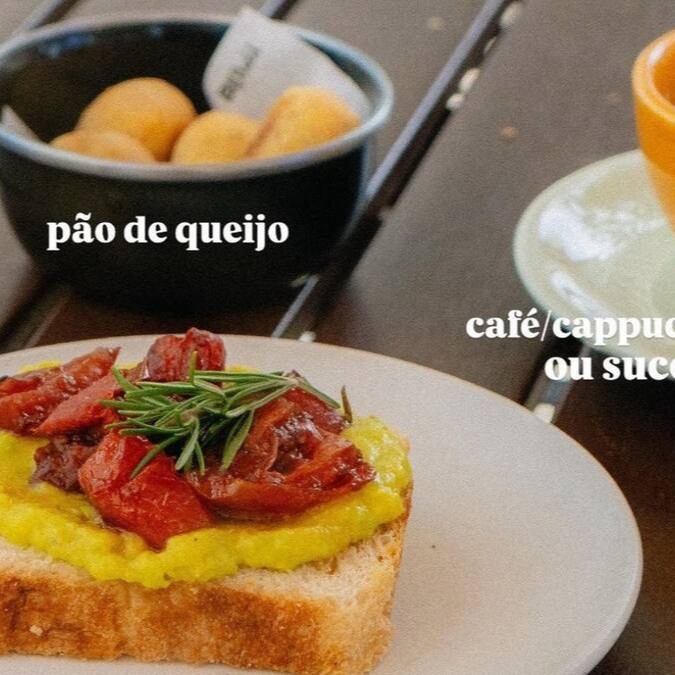 MINI PÃO DE QUEIJO VEGANO, TOAST DE ABACATE E CAFÉ (FILTRADO OU CAPPUCCINO VEGANO) OU SUCO.