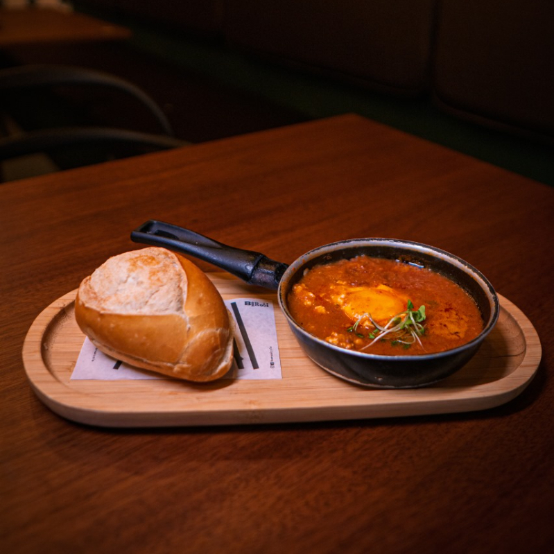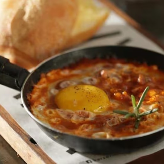 OVO COZIDO NO MOLHO DE RAGU COM LINGUIÇA. ACOMPANHA TOAST DE PÃO FRANCÊS OU ITALIANO.