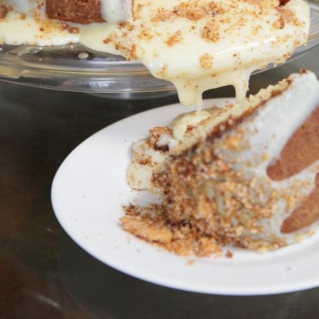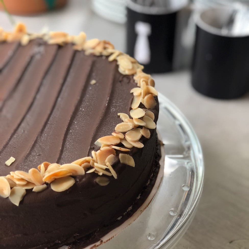 Bolo de chocolate coberto com ganache 70% e amêndoas laminadas.