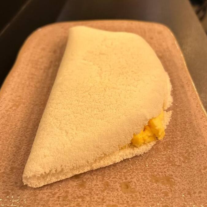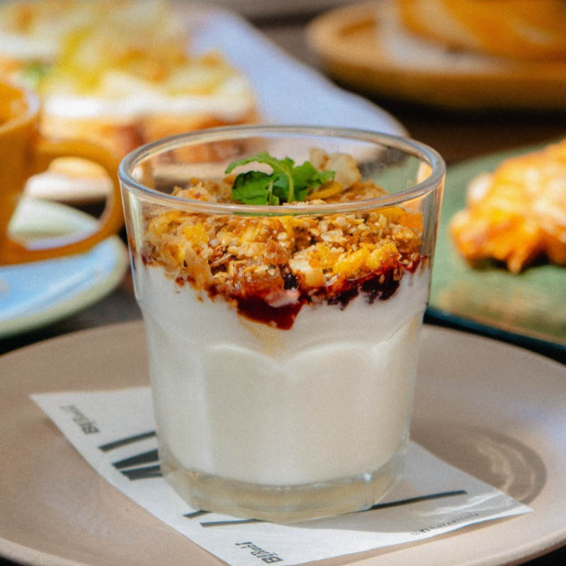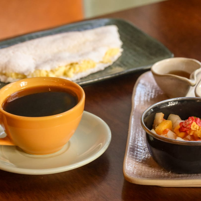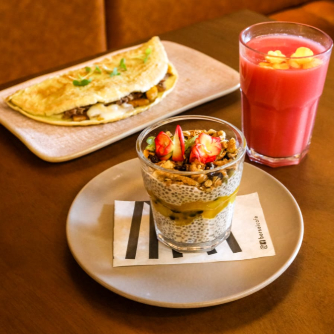 Tapioca ou crepioca de carne de sol com banana da terra e queijo minas + Parfait de chia + Filtrado V60, Suco ou Mate gelado com limão.