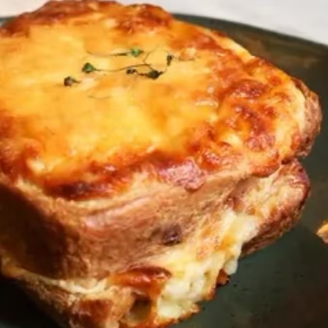 Brioche com queijo e parma coberto com molho cremoso e gratinado, finalizado com ovo estrelado com a gema mole.