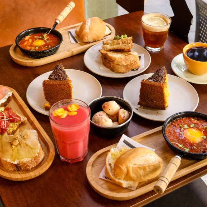 SUGESTÃO ¾ PESSOAS: 1 SANDUÍCHE QUEIJO QUENTE, 2 OVOS NO PURGATÓRIO, 1 TRIO DE TOAST, 1 PORÇÃO MINI PÃO DE QUEIJO NORMAL OU FIT, 2 FATIAS DE BOLO DO DIA, 3 CAFÉS (FILTRADO OU CAPPUCCINO) OU SUCO DO DIA.
