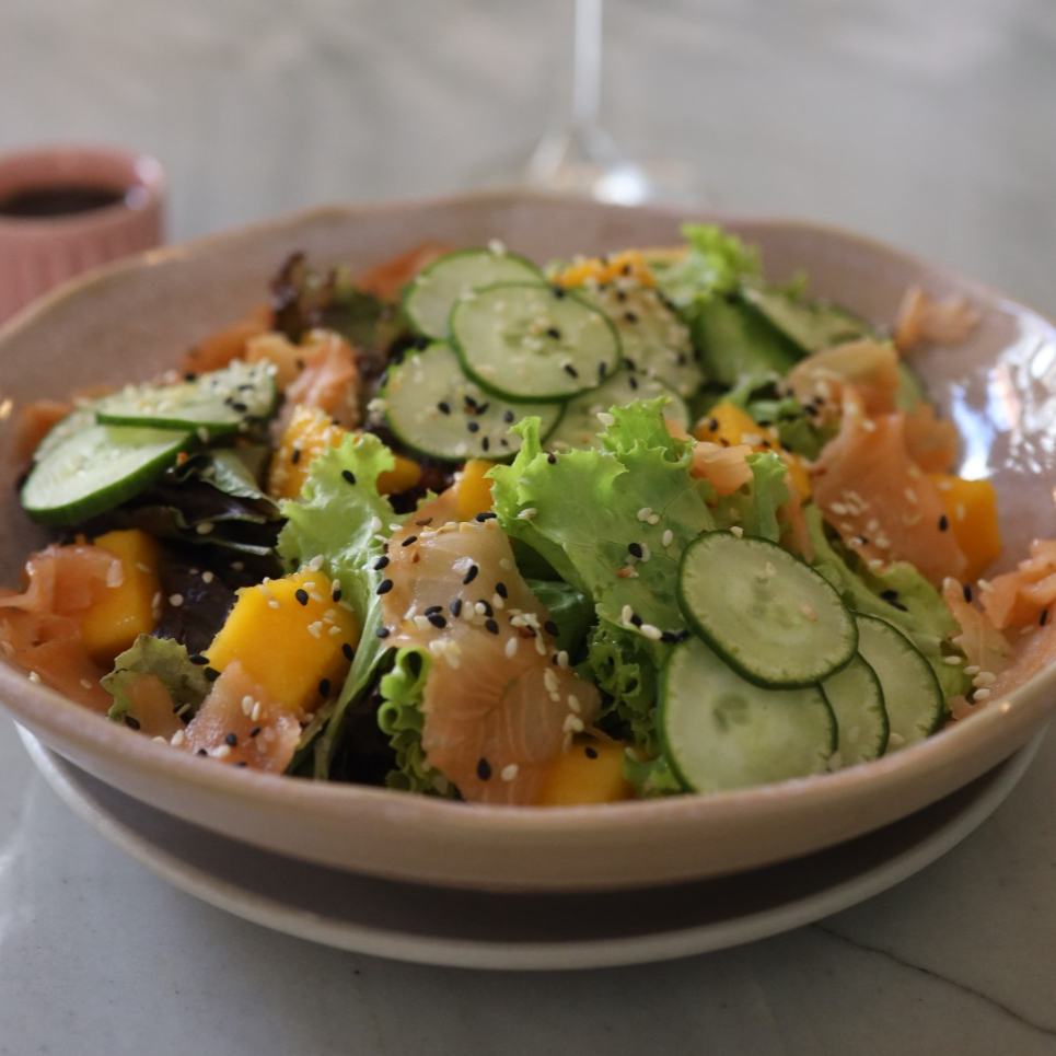 Mix de folhas, salmão defumado, cubos de manga, pepino japonês, gergelim e molho oriental