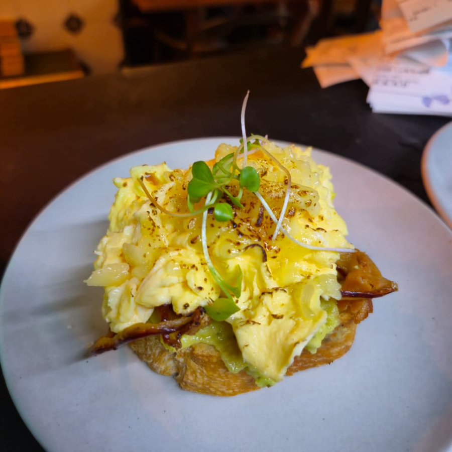 Dois ovos mexidos ou fritos com gema mole. Acompanha toast de pão francês.