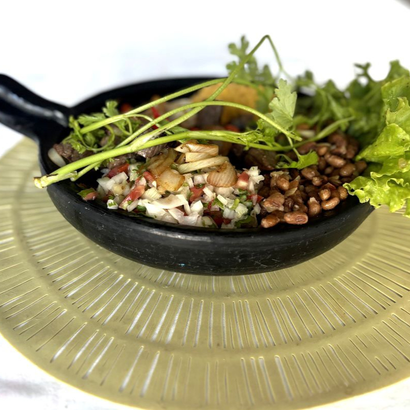 Feijão verde ou macassar, arroz branco, queijo coalho, catupiry e carne de sol acebolada
