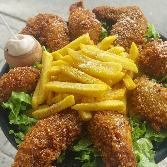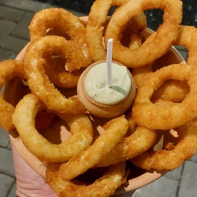 Aproximadamente 10 a 11 aneis de cebolas empadados com maionese da casa