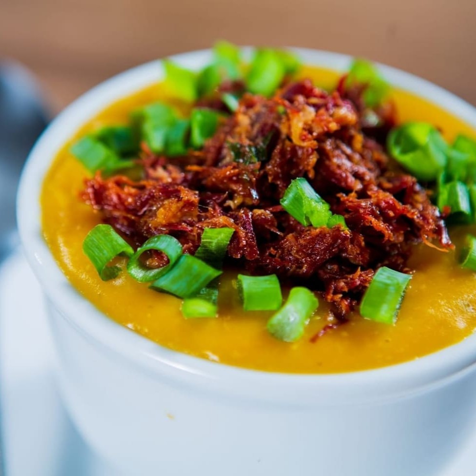 Base de macaxeira , Calabresa , Bacon e frango, e varias especiarias! Otimo caldoooo!!