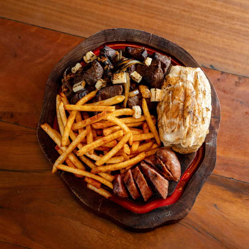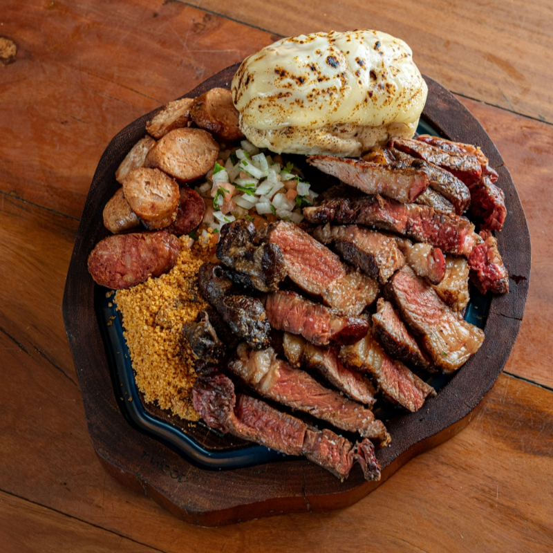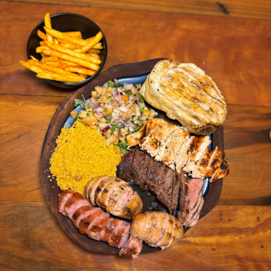 Maminha premium + Steak de Fango + Linguiça suina + Linguiça de Frango + Pão de Alho + Fritas + Farofa + Vinagrete.