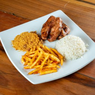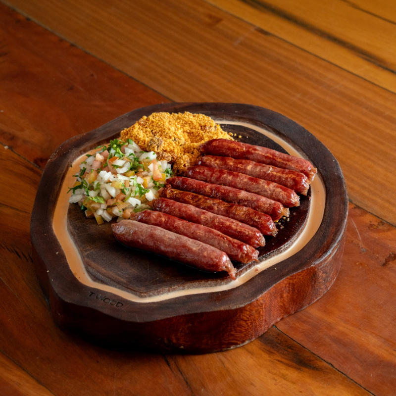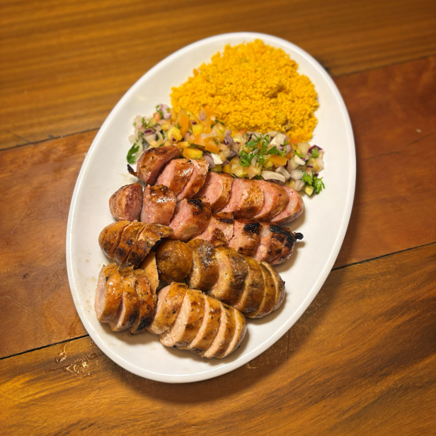 Duas linguiças de frango + duas suínas, grelhadas e suculentas, acompanhadas de farofa e vinagrete.