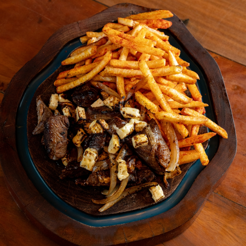 Carne de Sol acebolada, suculenta, acompanhada de queijo coalho derretido e nossas fritas crocantes.