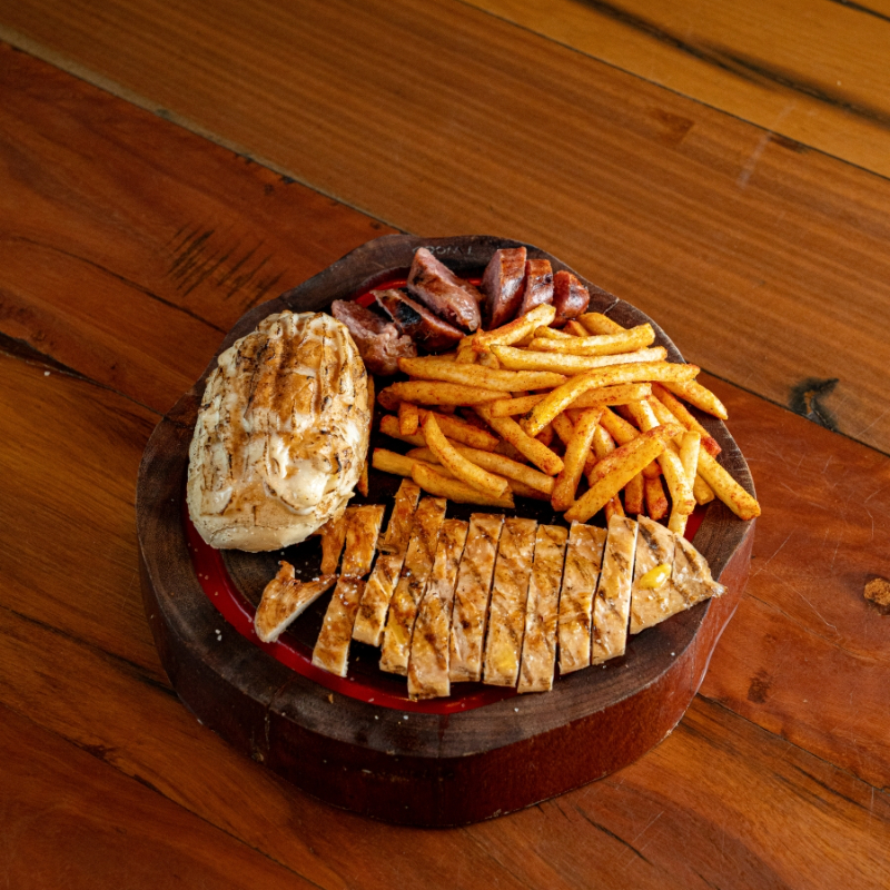 Frango acebolado, linguiças de Frango, pão de alho quentinho e fritas crocantes.