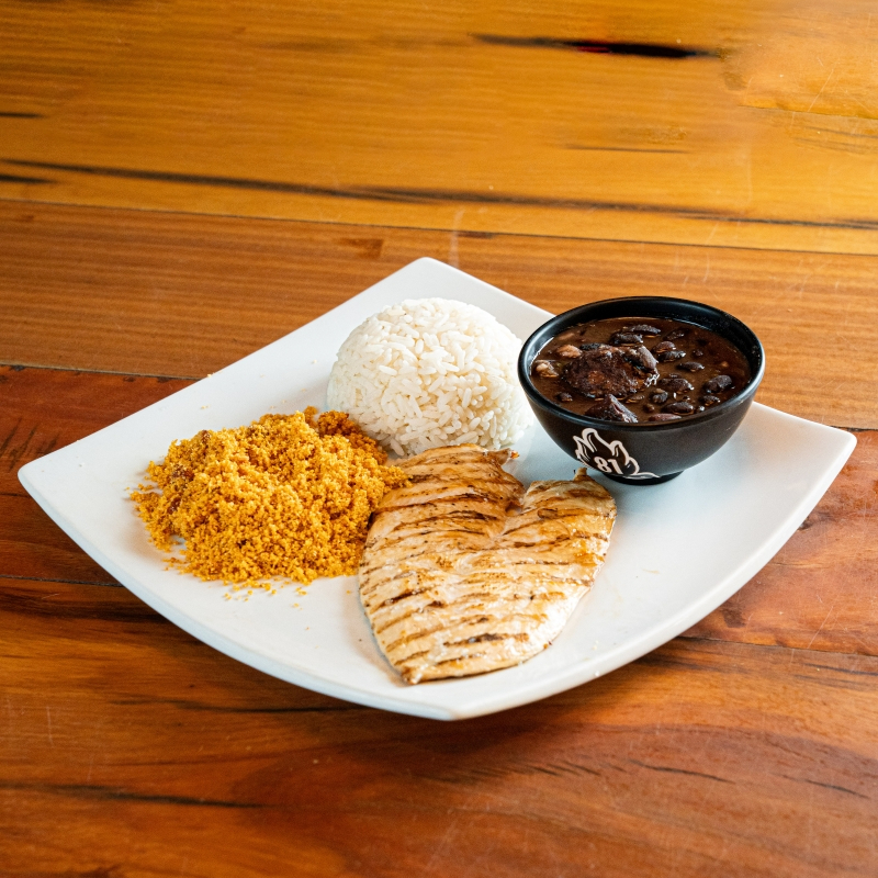 Filé de Peito de Frango grelhado com perfeição, 3 guarnições e 1 molho