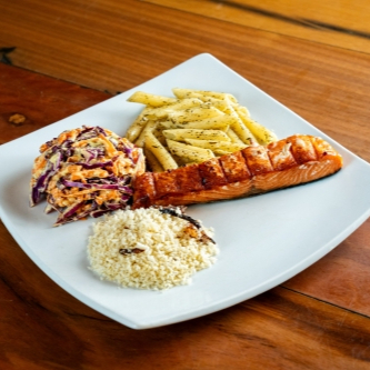 Salmão fresco e suculento, grelhado na parrilla, 3 acompanhamentos e 1 molho