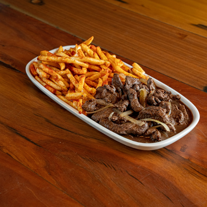 Iscas de filé suculentas, refogadas com cebolas caramelizadas e envoltas em nosso molho madeira aromático e encorpado. Acompanhadas de batatas fritas crocantes.