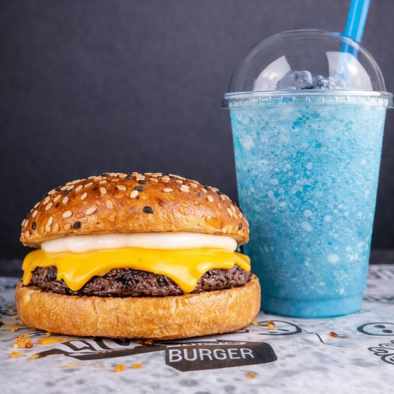 Hambúrguer smash com carne bem fininha e suculenta, queijo cheddar totalmente derretido e maionese cremosa, servido no pão macio com gergelim. Acompanha Milkshake Blue Ice 300 ml, bem gelado, refrescante e irresistível. ❄️🍔🥤