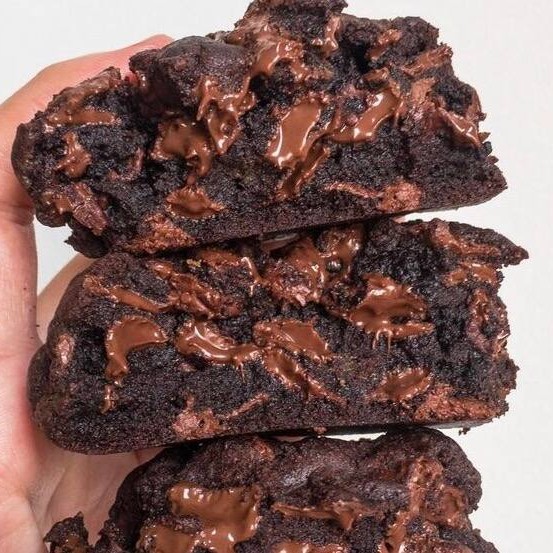 Cookie bem intenso de cacau black com gotas de chocolate branco, chocolate ao leite e com um bombom Alpino no meio.