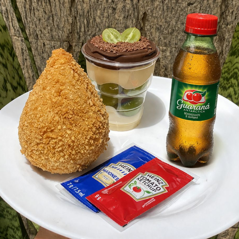 1 COXINHA DE FRANGO/ 1 ESCONDIDINHO DE UVA/ 1 GUARANA