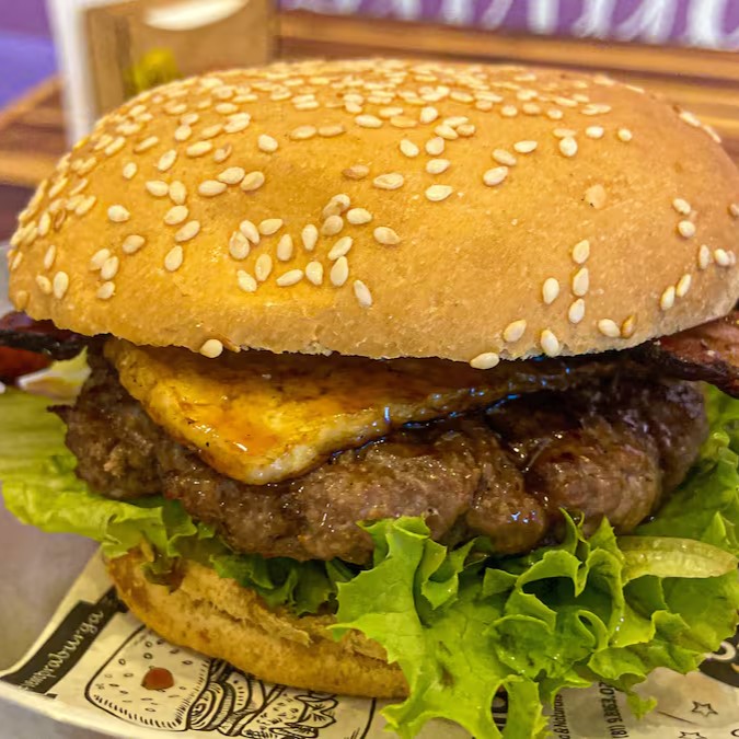 Pão tradicional da casa, alface, tomate, cebola dourada na chapa, burguer caseiro de 100g, queijo derretido e ovo.