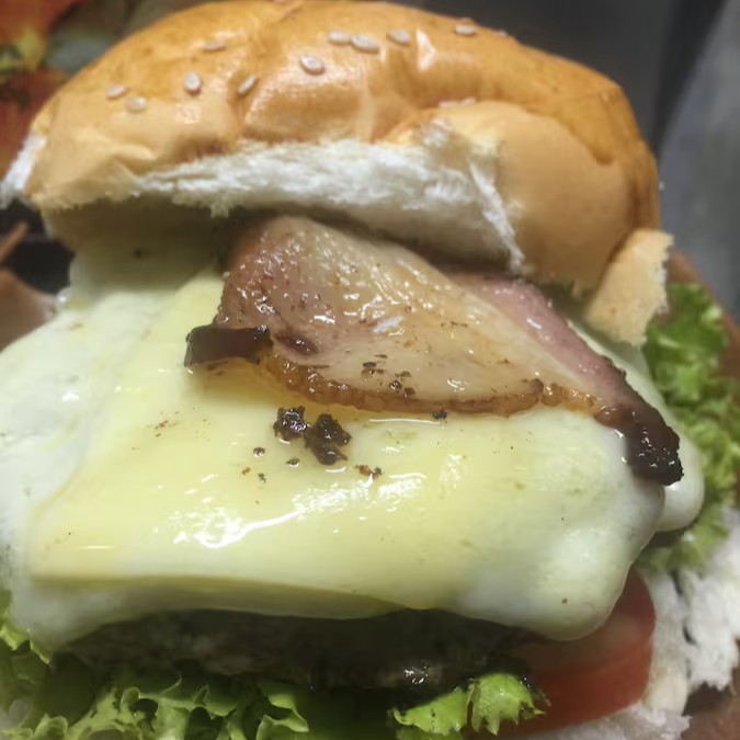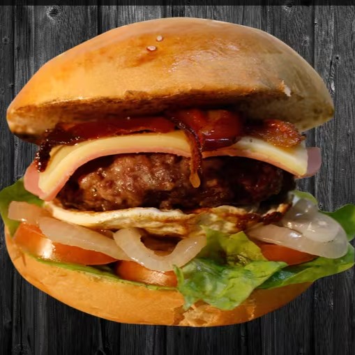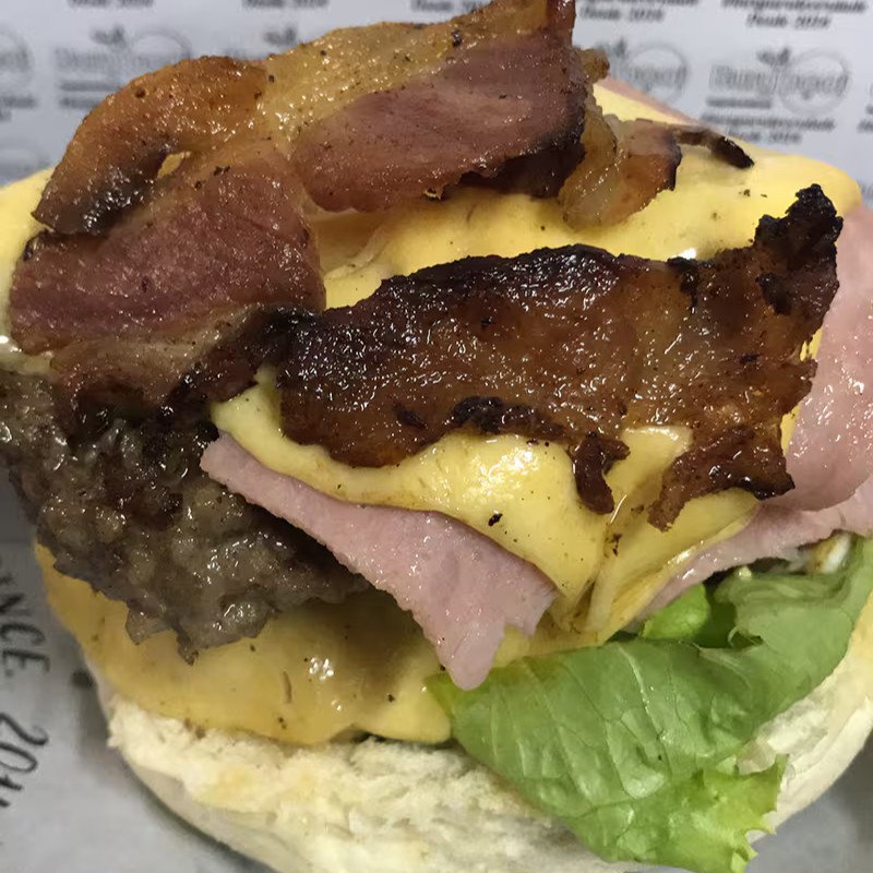 2 carnes tradicionais de hambúrguer (não artesanais), 2x queijo mussarela, 2x presunto, milho, bacon, ovo e cebola caramelizada.