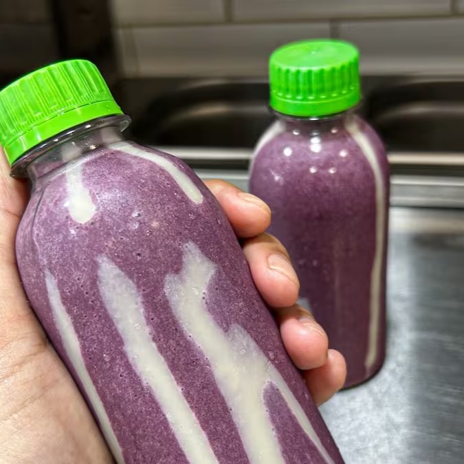 Açaí batido com leite em pó, banana e leite condensado na garrafinha! Uma combinação deliciosa.