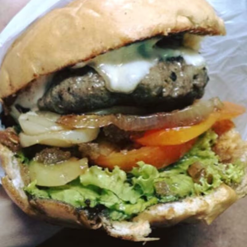 pão, salada, hambúrguer caseiro de 100g, queijo, ovo, presunto e 1 fatia de bacon.