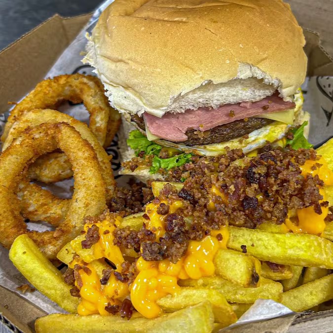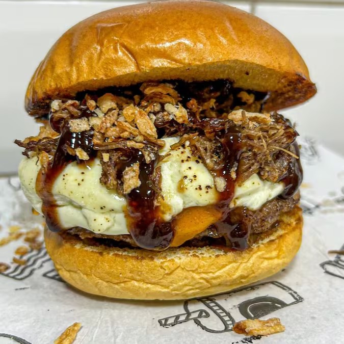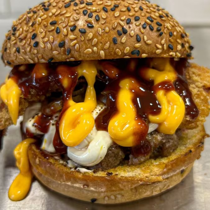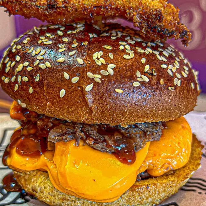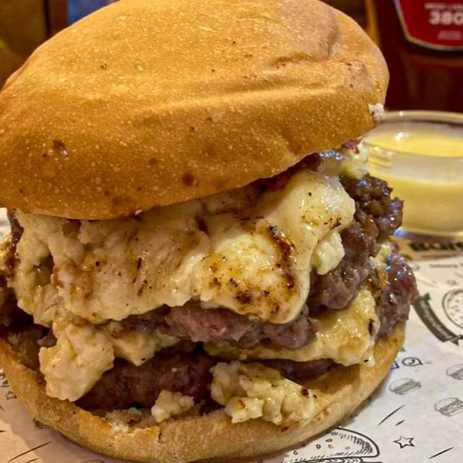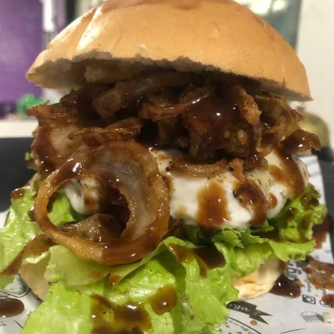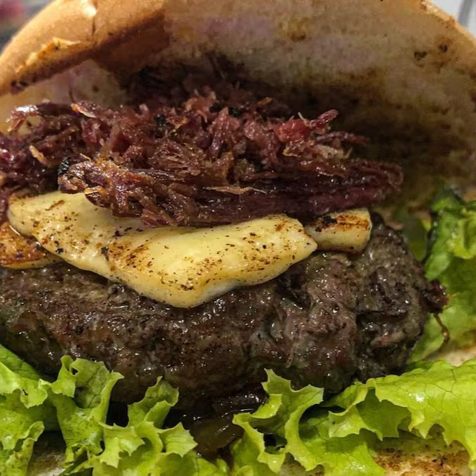 2 blends de 110g, cheddar cremosão nas duas carnes, 1 porção de cupim desfiado, cebola caramelizada, Bbq feito na casa, um bacon empanado por cima, servido no pão American Bread. Duvido tu provar e se arrepender.