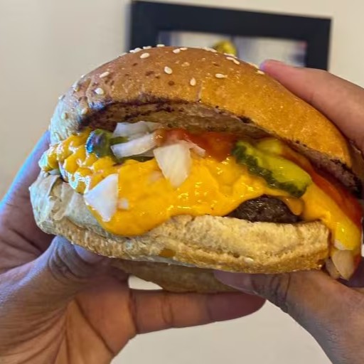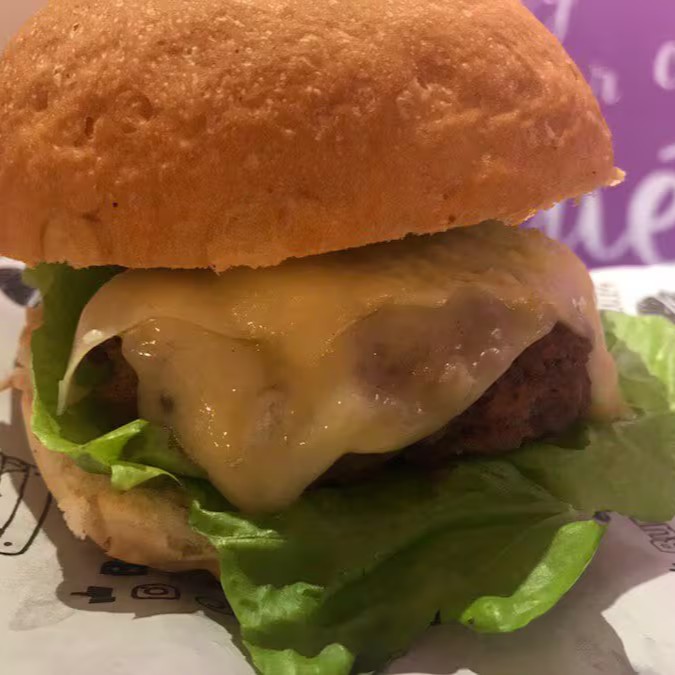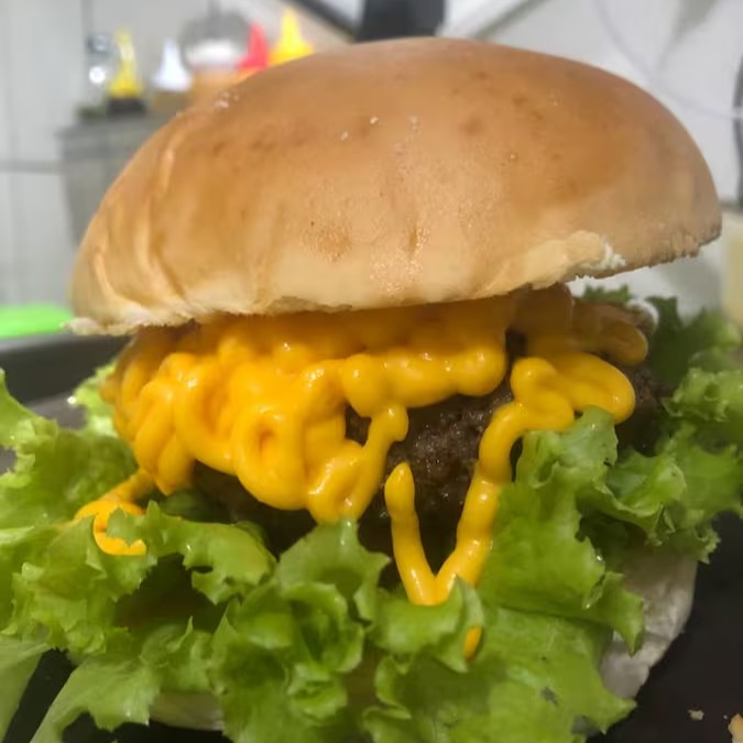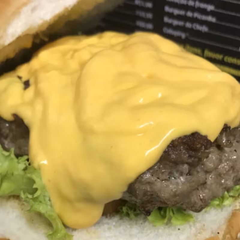 Pão com gergelim, burguer bovino de 120g, 1 fatia de queijo cheddar, mais queijo cheddar cremoso, picles, cebola crua picadinha, mostarda e catchup.