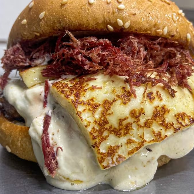 Pão bola com gergelim, 2 burgueres bovinos de 100g, charque desfiada chapeada e 2 pedaços de queijo coalho (1 em cada carne)!