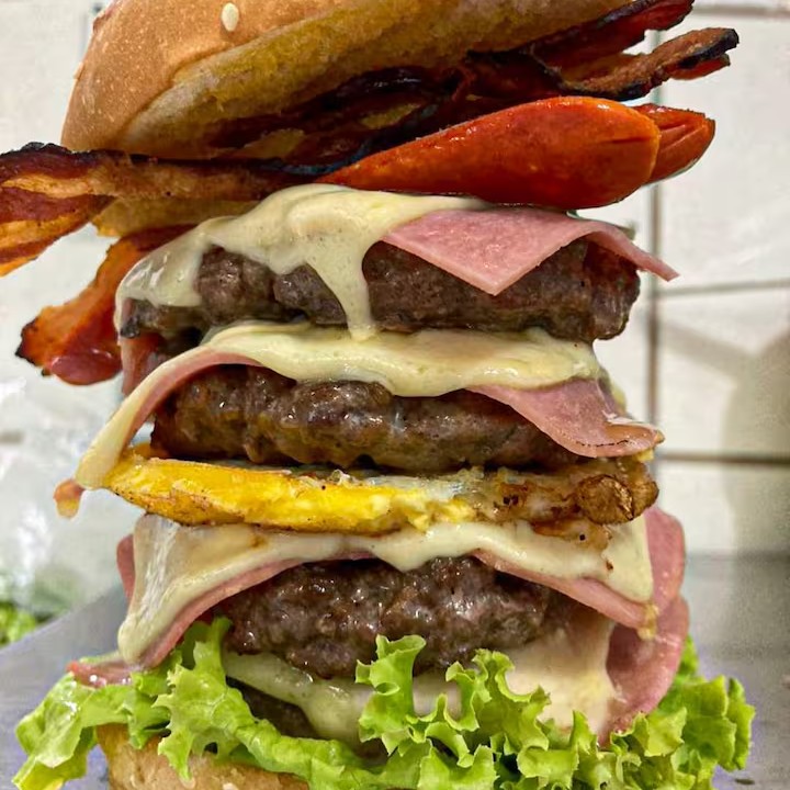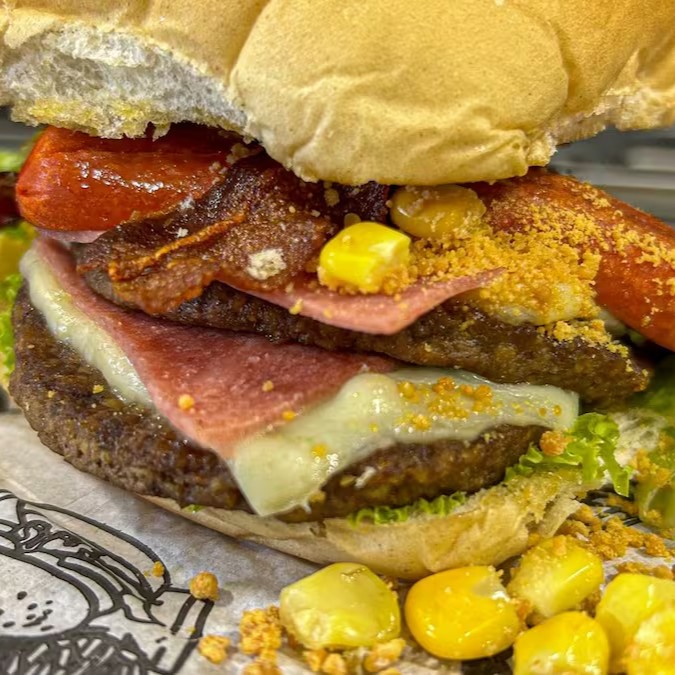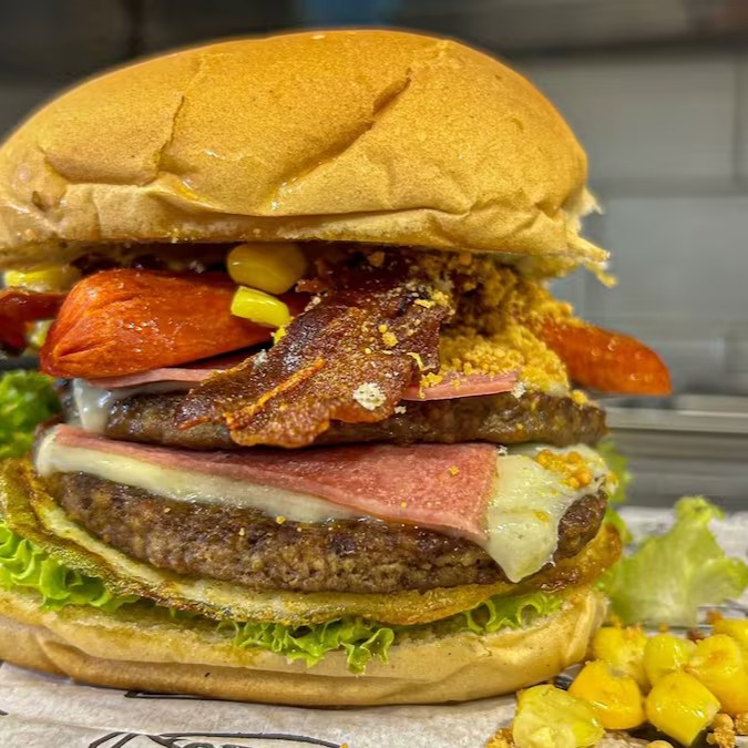 2 carnes tradicionais de hambúrguer (não artesanais), 2x queijo, 1 ovo, 2x presunto, bacon, alface, cebola caramelizada, milho, queijo ralado e salsicha.