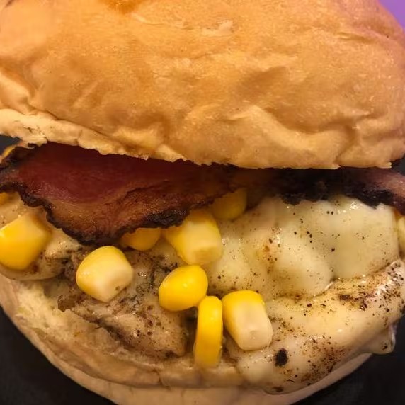 Pão tradicional da casa, alface, tomate, cebola , 100 gr de filé de frango, queijo derretido, bacon e milho.