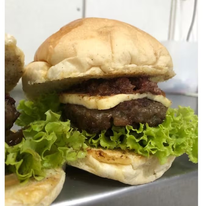 pão, salada, hambúrguer caseiro de 100g puxado no shoyo com cebolas + cheddar cremoso. Peso dos produtos in natura.