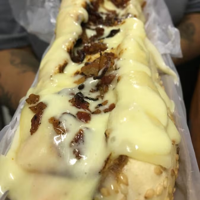 2 salsichas, queijo cheddar e muçarela maçaricados com bacon, servido em 2 pães de cachorro quente