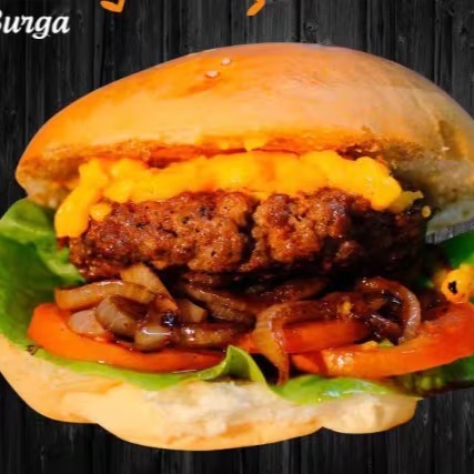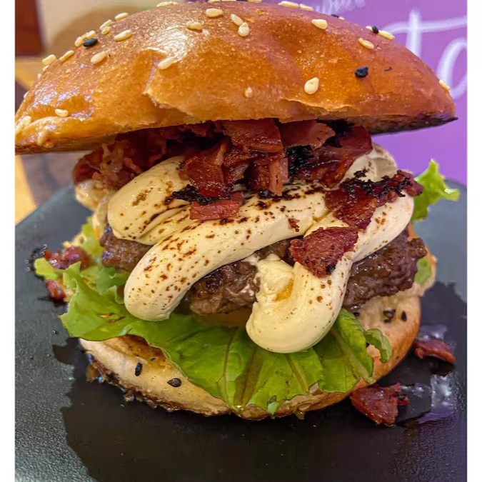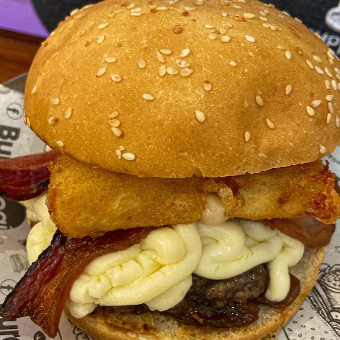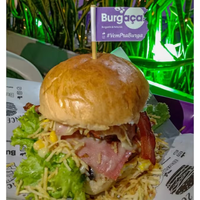 2 carnes tradicionais de hambúrguer (não artesanais), 2x cheddar cremoso da Burga , bacon e cebola caramelizada.