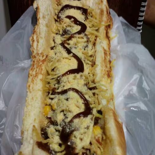 2 salsichas, molho de tomate, cebola e tomate picados, milho, bacon bites, queijo ralado e batata palha servido em 2 pães de cachorro quente