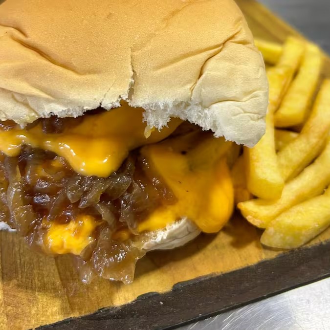 Cheddar cremoso (1 burger industrial, cheddar cremoso da casa e cebola caramelizada e 1 fatia de bacon) mais uma porção de batata frita P