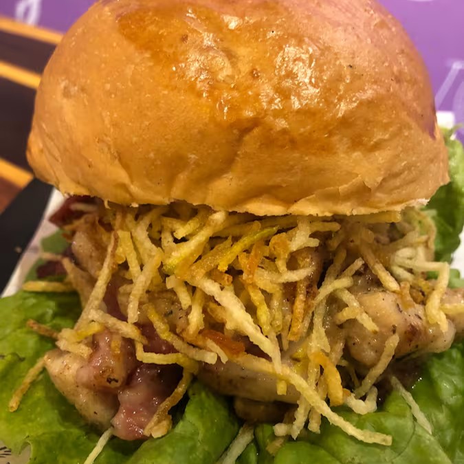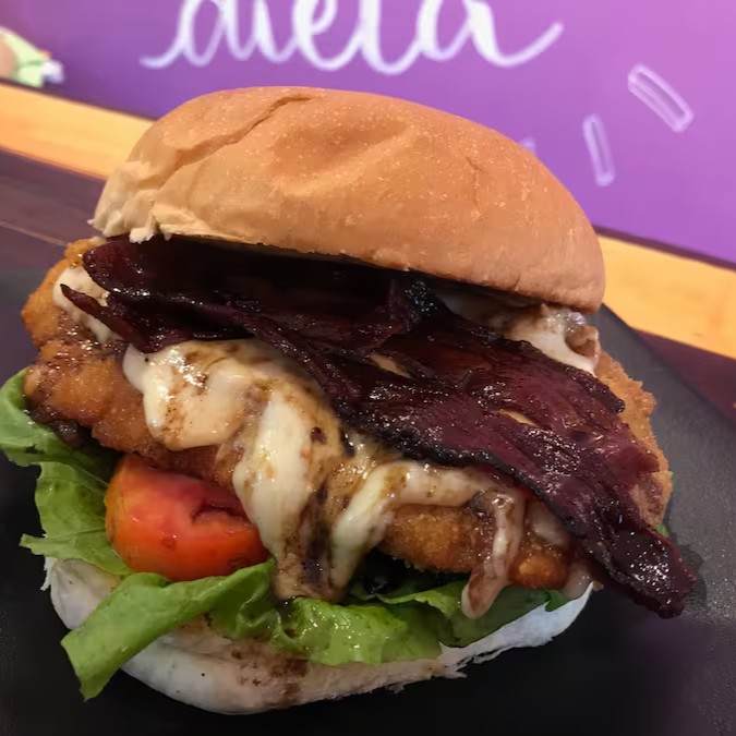 Pão tradicional da casa, file de frango empanado com receita especial da casa, alface, tomate e cebola dourada na chapa e para dar o toque: bacon caramelizado :) :) pede logo o teu!